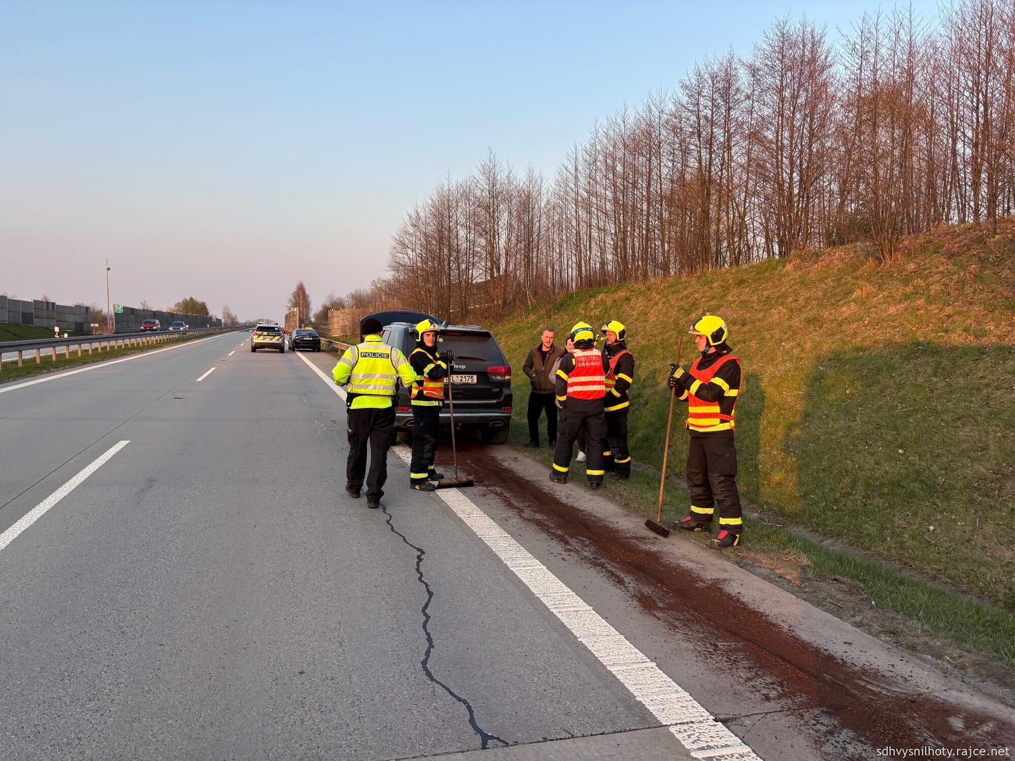 Dne 11.4.2026 v 18:32 hod. jsme byli povoláni v rámci stáže na HZS ÚO FM na „Únik nebezpečných látek na komunikaci, dálnice“. Jednotka po příjezdu na místo události, pomáhala s úklidem vozovky. Z osobního vozidla vytekl olej na dálniční těleso.